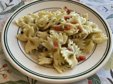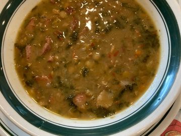 Bacon, sausage, kale, peppers lentils, onion