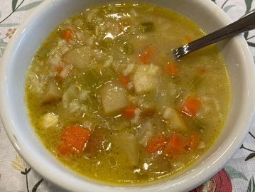 Chicken, celery, onion, carrots, curry, apples, cream